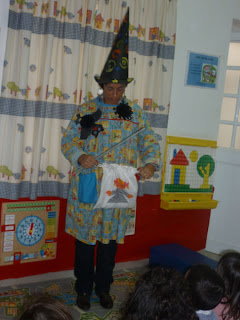 Ao longo da semana as crianças fizeram morcegos, aranhas, abóboras e fantasmas (com folhas pintadas) para o painel alusivo ao tema. Na sexta-feira, coloquei o meu chapéu de bruxa, fiz magia e uma a uma, as crianças de 5 anos tiraram uma palavra mágica do saco, tendo por missão reproduzi-las no computador. Para terminar o dia, fizemos o tradicional doce de abóbora.